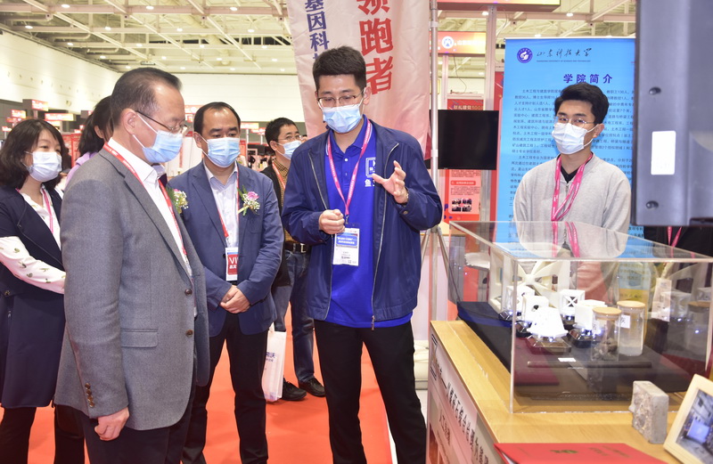 本届“高博会”期间,首届高等学校科技创新大会同期举办。“献礼建党100周年”高校科技创新成果展是创新大会的重要板块,筛选了来自全国61所高校的336个科技创新成果进行展出,博鱼网页版科技处精心组织学校相关成果参会,筛选了井巷喷浆粉尘污染防治关键技术及装备、铝离子电池等12项科技成果参展,基本涵盖了所有八大展区,通过设备实物展台展出,多媒体设备播放、展板展示等多样化的展示形式参展,生动直观地将学校科技成果进行呈现,吸引了众多观众关注。