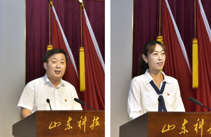 优秀共产党员代表数学学院赵文才、优秀党务工作者代表资源学院高尚宇、先进基层党组织代表能源学院董桂刚和艺术学院郑晓晴分别发言,表达了对伟大中国共产党百年华诞的美好祝福,宣誓了在新时代继续发奋图强、勇立潮头建新功的信心和决心。