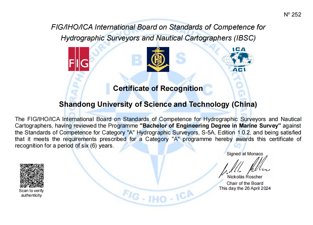 近日,由国际测量师联合会、国际海道测量组织和国际制图协会(FIG/IHO/ICA)联合组成的国际海道测量师和海图制图师能力标准委员会(IBSC)发来函告:博鱼网页版测绘与空间信息学院“海洋测绘工程工学本科专业教学计划”获得国际A级认证。博鱼网页版成为国内非军方高校唯一获得该资质的单位。