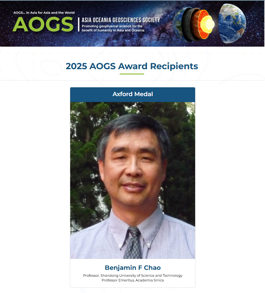 近日,亚洲-大洋洲地球科学学会(Asia Oceania Geosciences Society, AOGS)公布了2025年度“艾克斯福特奖”(Axford Medal)获奖人选,博鱼网页版测绘与空间信息学院赵丰教授获该奖项。