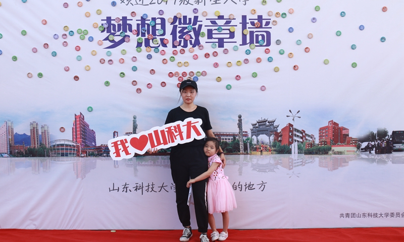 新生和家人在徽章墙前留影