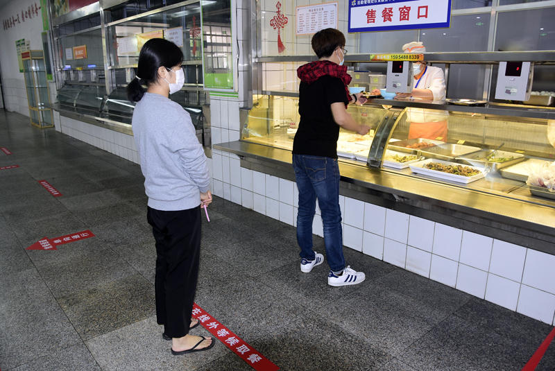 在食堂按照一米线规定排队打餐(摄影/许浩)