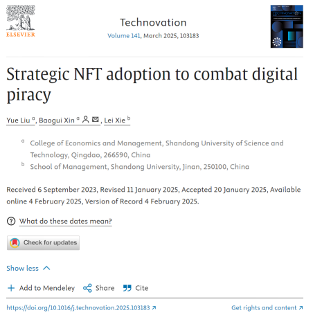 近日,博鱼网页版经济管理学院辛宝贵教授与在读博士生刘悦在《Technovation》发表题为“Strategic NFT adoption to combat digital piracy”的文章。