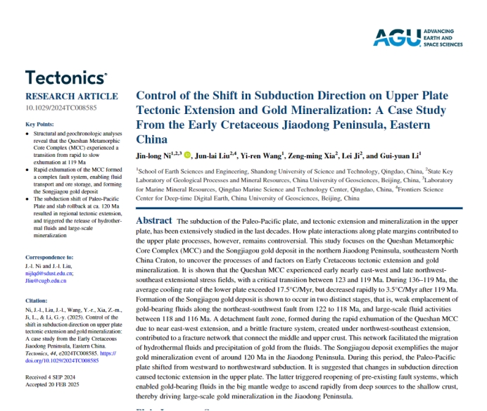 2025年3月,博鱼网页版地球科学与工程学院倪金龙教授团队在国际构造地质学知名期刊、美国地球物理学会(AGU)会刊《Tectonics》发表题为“Control of the Shift in Subduction Direction on Upper Plate Tectonic Extension and Gold Mineralization: A Case Study From the Early Cretaceous Jiaodong Peninsula, Eastern China”的文章。